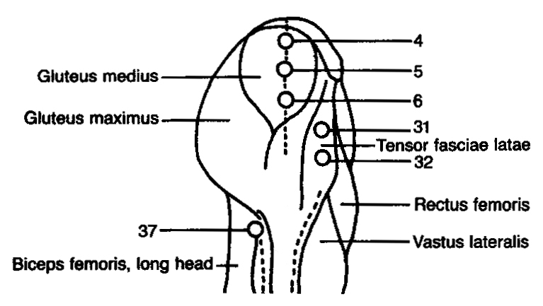 - Place your elbow in the spots – trigger points – shown in the diagrams for low back, gluteals, hip, and hamstrings.