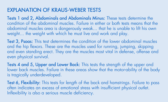 The Kraus-Weber tests are the labor of more than fifteen years of study by two Austrian émigrés, Drs. Hans Kraus and Sonja Weber. In 1940 Dr. Weber founded the Posture Clinic at Columbia Presbyterian Hospital in New York City and she asked her friend Dr. Kraus to join her there. The tests for Minimum Muscular Strength and Flexibility were NOT designed for healthy people, but to determine the minimum muscular effectiveness that persons suffering with various disabilities — for example, disabling backache or posture problems — must have to be able to overcome their difficulties.